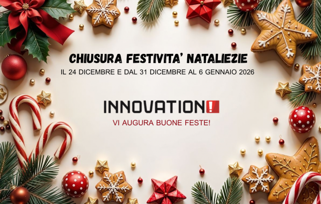 Vi informiamo che Innovation sarà chiusa per ferie il 24 dicembre e dal 31 dicembre al 06 gennaio 2026.